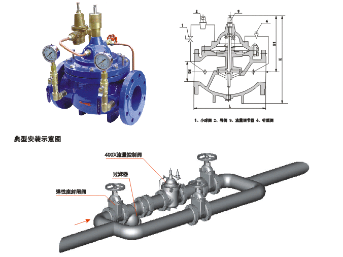 400X流量控制閥是一種采用高精度先導(dǎo)方式控制流量的多功能閥門。 當(dāng)閥門從進(jìn)口端給水時,水流過針閥進(jìn)入主閥控制室,并經(jīng)過導(dǎo)閥、球閥流出主閥控制室到出口,此時主閥處于全開或浮動狀態(tài)。調(diào)定主閥上部的流量調(diào)節(jié)閥,可為主閥設(shè)定一定開度。調(diào)節(jié)針閥開度和調(diào)節(jié)導(dǎo)閥彈簧壓力,即可使主閥開度保持在設(shè)定開度,并在壓力變化時導(dǎo)閥進(jìn)行自動調(diào)節(jié),保持流量不變。該系列流量控制閥適用于配水管需控制流量和壓力的管路中,保持預(yù)定流量不變,將過大流量限制在一個預(yù)定值,并將上游高壓適當(dāng)減低,即使主閥上游的壓力發(fā)生變化,也不會影響主閥下游的流量。