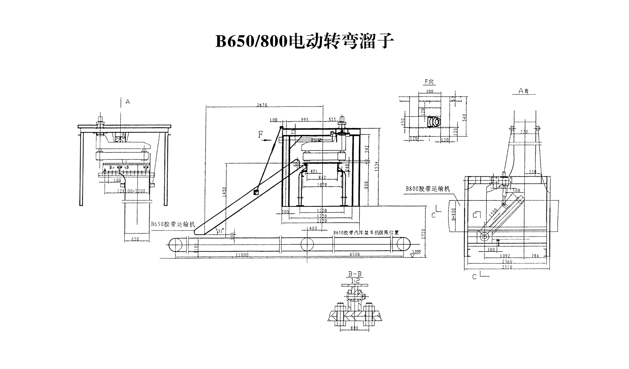 1、A向視圖中箭頭表示水泥包由B800膠帶運輸機電動轉(zhuǎn)彎溜子運到B650膠帶機。